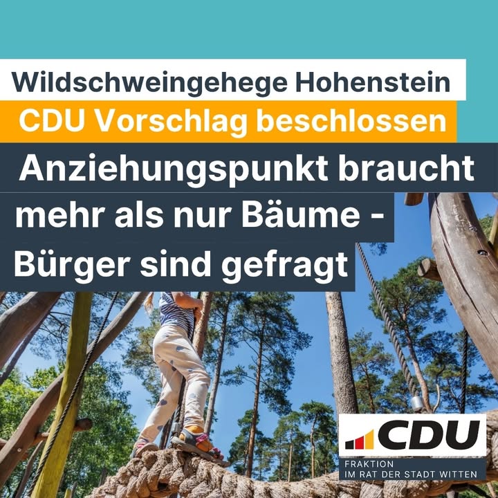 🐗 Rettet das Wildschweingehege am Hohenstein! 🌳Heute im Ausschuss für Stadtentwicklung und Umweltschutz geht es um eine Entscheidung mit großer Tragweite:Die Verwaltung will das Wildschweingehege am Hohenstein endgültig abbauen ? und durch eine "experimentelle Waldfläche" ersetzen.Wir sagen klar: Stopp!Das Wildschweingehege ist mehr als nur ein Gehege. Es ist Kindheitserinnerung. Lernort für Schulen und Kitas. Familienausflug ohne Eintritt. Ein Stück Wittener Identität. Über Generationen hinweg war es ein Anziehungspunkt ? für Bürgerinnen und Bürger genauso wie für Gäste aus der Region.Dabei zeigen die geltenden Leitlinien: Eine tierschutzgerechte Haltung von Schwarzwild ist möglich. Statt Rückbau braucht es ein tragfähiges Konzept für den Fortbestand!Ein "Versuchswald" mag wissenschaftlich interessant sein ? aber er wird niemals das ersetzen, was das Wildschweingehege für unsere Stadt bedeutet. Nicht nur ein touristischer Mehrwert für unsere Stadt und die Menschen, sondern ein Tor für Familien in die einzigartige Natur, die seinesgleichen sucht!💬 Lasst uns gemeinsam ein Zeichen setzen für Tradition, Bildung, Familienfreundlichkeit und Lebensqualität in Witten.Der Hohenstein braucht seine Wildschweine zurück.#wildgehegeerhalten#freizeit #hohenstein #starkvorort #cduwitten